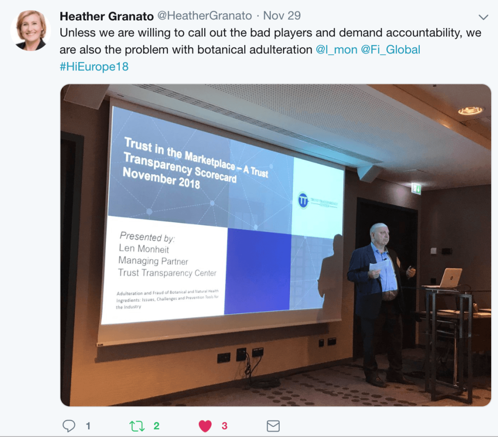 UBM has combined the event into a bigger Nutrition Week program with workshop content on many topics around and outside the halls. I had the opportunity to participate in such a session hosted by Euromed on botanical adulteration. My presentation was entitled ‘Trust in the Marketplace’, attempting to understand the implications should the botanicals category, or industry as a whole, ultimately lose any measure of consumer trust, in this more transparent age. The risks are large, the costs are huge, and my chief take-away from the presentations I attended was that product quality and adulteration are global issues, and while we can and do smugly say that the culprits are ‘not in the room’, that doesn’t mean it’s not the problem of those in the room to do more – much, much more than they are currently doing to self-enforce against those that willfully or ignorantly don’t do the right things. When 50 percent of products tested in a category don’t meet label claim, and many are adulterated, that’s a problem and it’s our collective problem and it must be addressed.